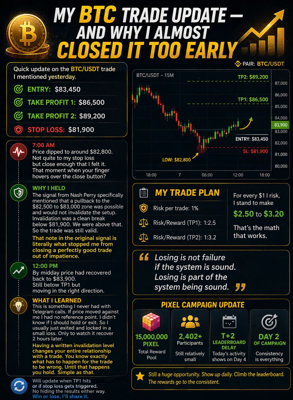 Here's why. The signal from Nash Perry specifically mentioned that a pullback to the $82,500 to $83,000 zone was possible and would not invalidate the setup. The invalidation was a clean break below $81,900. We were above that. So the trade was still valid.