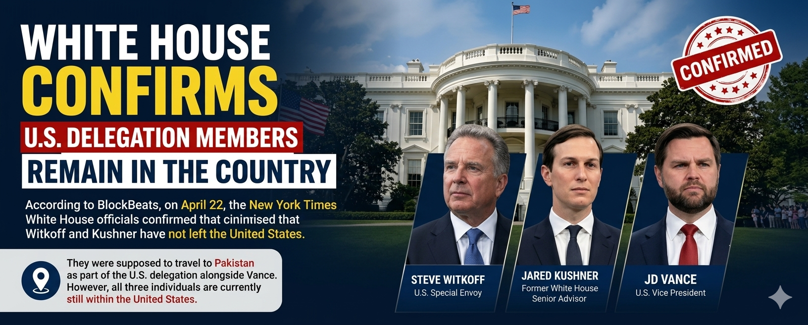 According to BlockBeats, on April 22, the New York Times reported that White House officials confirmed that Witkoff and Kushner have not left the United States. They were supposed to travel to Pakistan as part of the U.S. delegation alongside Vance. However, all three individuals are currently still within the United States.