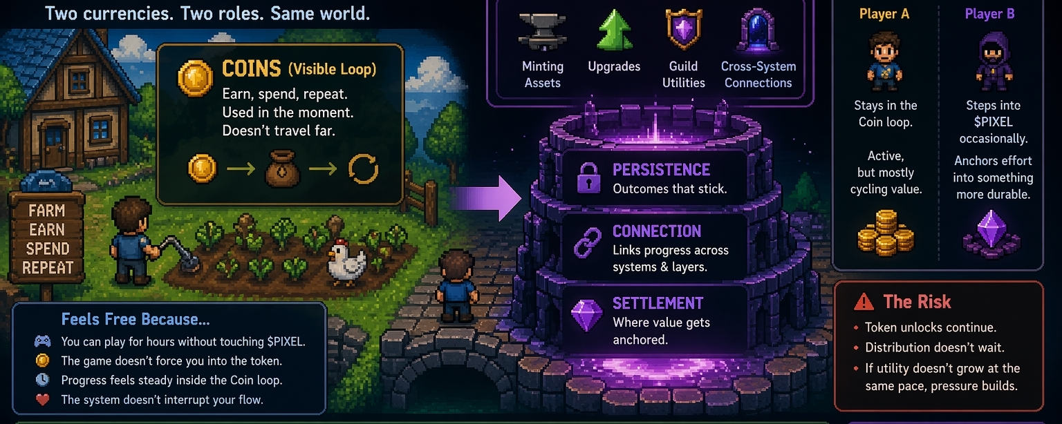 You can spend hours inside the game without ever touching $PIXEL. The farming loop runs fine, Coins circulate, and nothing forces you to step outside that cycle. It feels complete on its own. But after watching it more closely, a small disconnect starts to appear. The effort players put in doesn’t always translate into something that lasts.