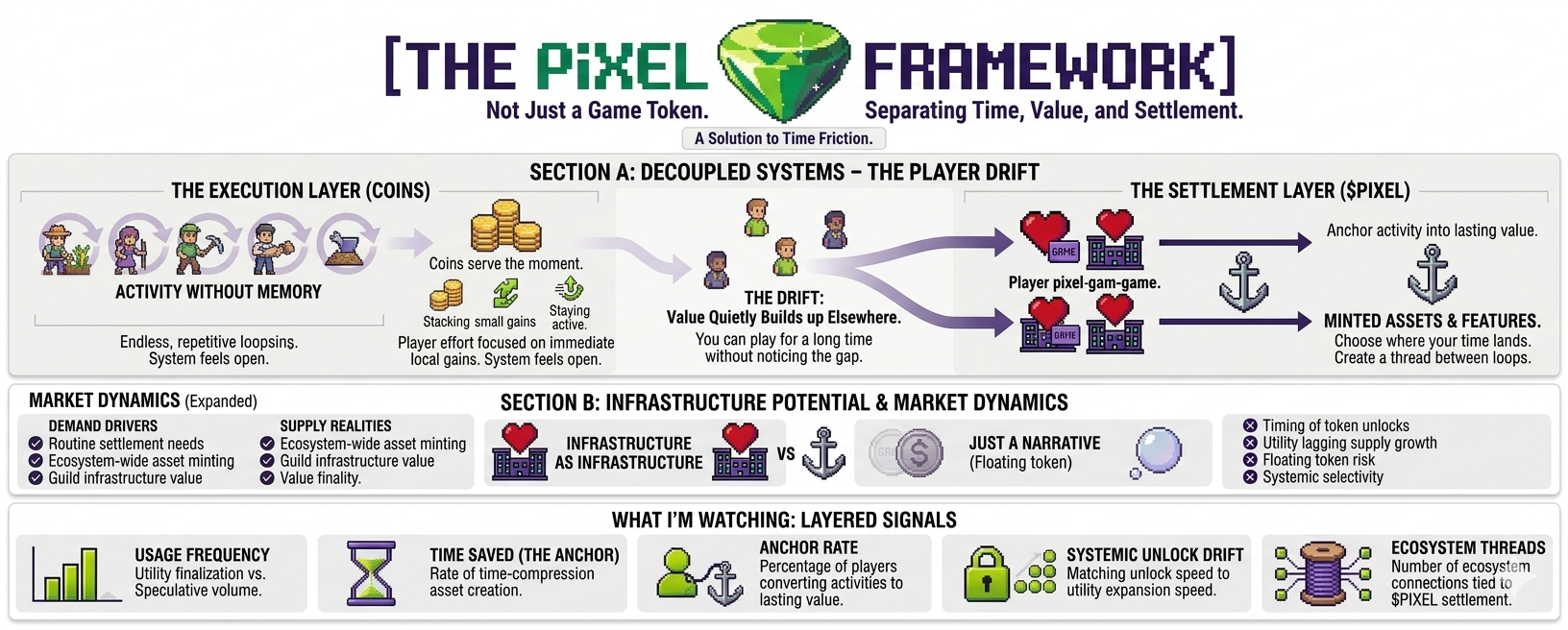 That sounds small, but it changes how the system behaves. Two players can play the same number of hours. One stays completely inside the Coin loop. Stacking small gains. Staying active. The other steps into $PIXEL occasionally. Not constantly. Just enough to anchor what they're doing into something that doesn't reset as easily.