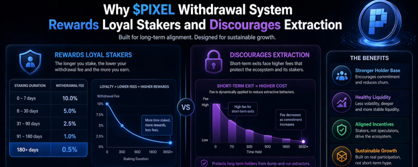 The idea behind a system like PIXEL’s withdrawal and liquidity fee model is simple on the surface, but the implications go deeper. Instead of treating liquidity as something to be exploited in short bursts, it reframes it as something that should reward time, consistency, and participation. In other words, it tries to align financial incentives with actual usage rather than pure speculation.