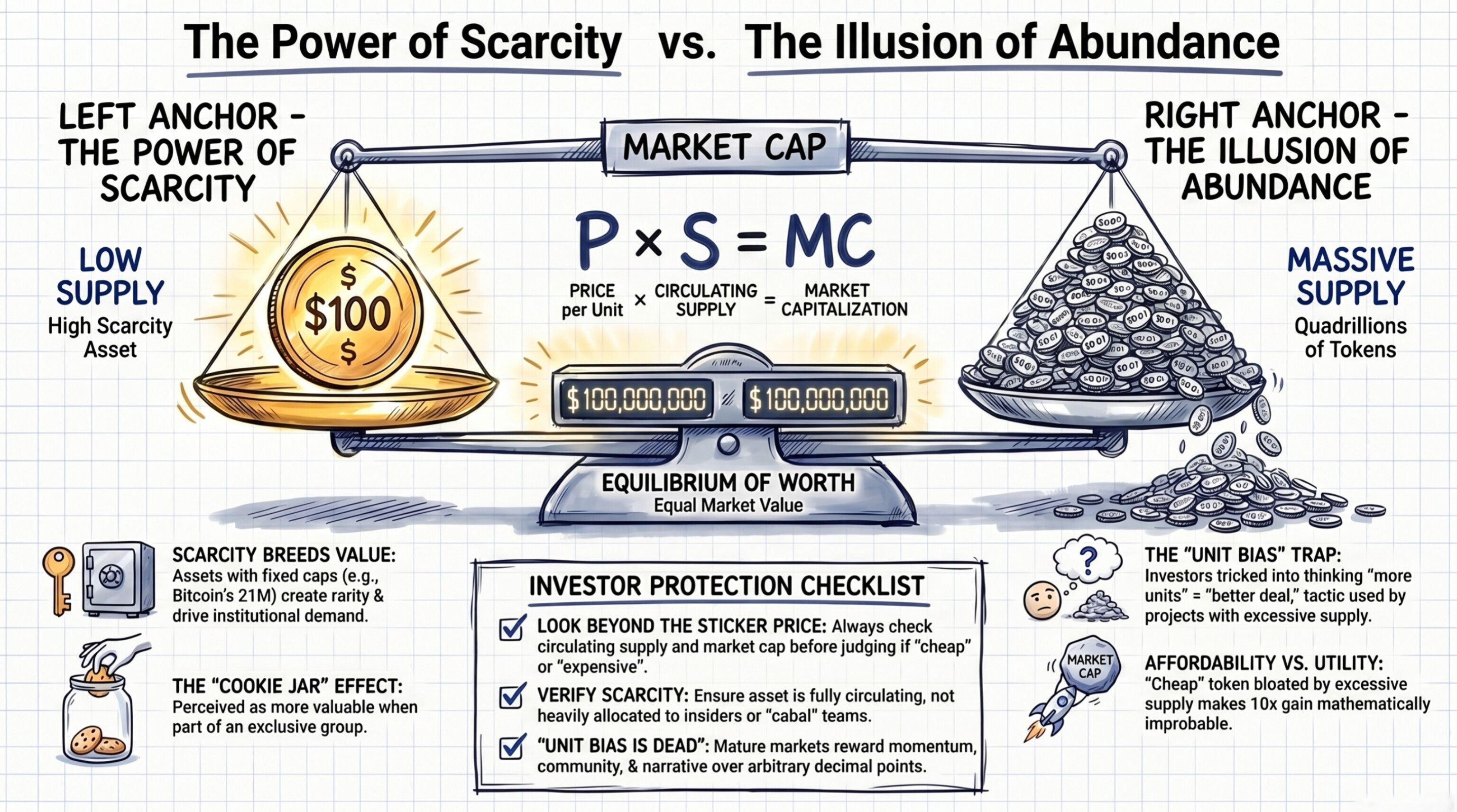 2️⃣ The Illusion of Abundance: Some projects create quadrillions of tokens to make the price look "cheap" (e.g., $0.000001). This is a psychological trick called Unit Bias.
