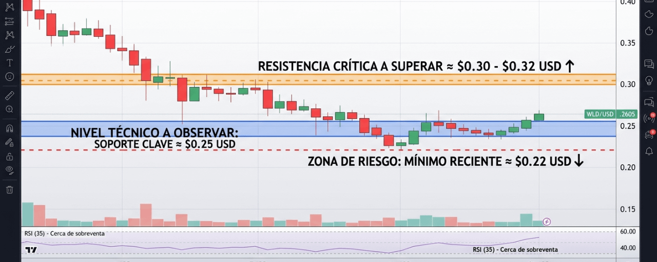 Resistencia: Para confirmar una recuperación real, WLD necesita cerrar por encima de los $0.30 - $0.32.