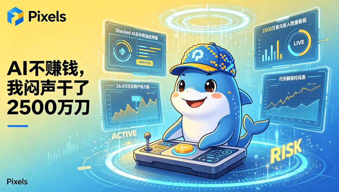 这不是巧合。Luke自己解释得很清楚:Stacked是Pixels过去四年所有工作的集大成者,是把AI真正用在刀刃上——不是让AI帮你写诗画画,而是用AI反作弊、反女巫,把真金白银的奖励精准地塞给真实玩家,而不是成百上千的脚本号。这套系统在Pixels内部跑了四年,处理过超100万日活用户,驱动了超过2500万美元的收入。