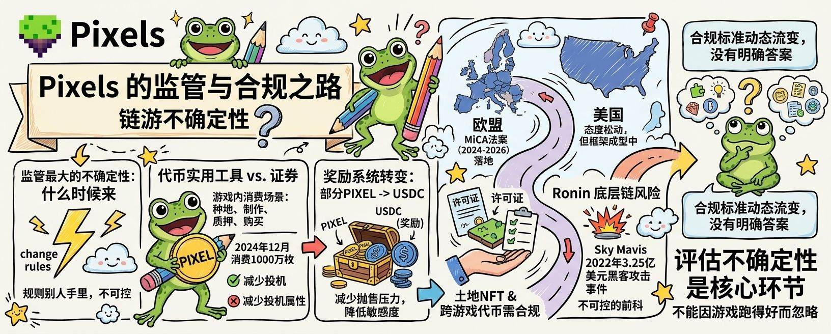 美国这边的情况稍微好一点,SEC在2025年之后对加密资产的态度有所松动,新的监管框架开始区分实用型代币和证券型代币,这对Pixels这种有游戏内消费场景的项目是偏利好的,但利好不等于没有风险,美国的监管框架还在成型过程中,现在看起来安全的设计,不代表两年之后还是安全的。