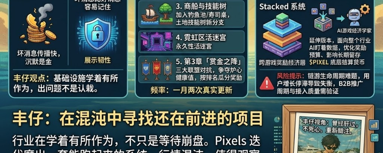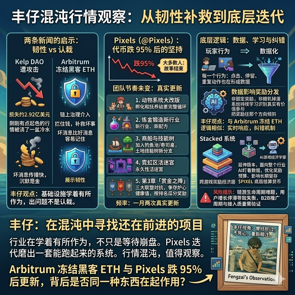 但有一件事,Arbitrum那条新闻让丰仔想得更清楚了:这个行业正在学着在出问题的时候有所作为,而不只是等待崩盘。Pixels在做的事情,本质上也是同一件事:不是在等一个完美的经济模型从天而降,而是在真实运行中不断发现问题、修正、再测试,用数百个更新版本和数亿次奖励发放记录,把一套能跑起来的系统磨出来。