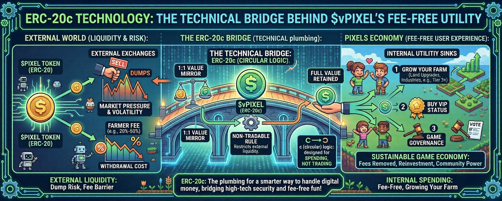 While most players care about how $vPIXEL saves them money, the secret to its success is a technical standard called ERC-20c. This "bridge" technology allows the game to offer a fee-free experience without losing the security and value of the blockchain.
