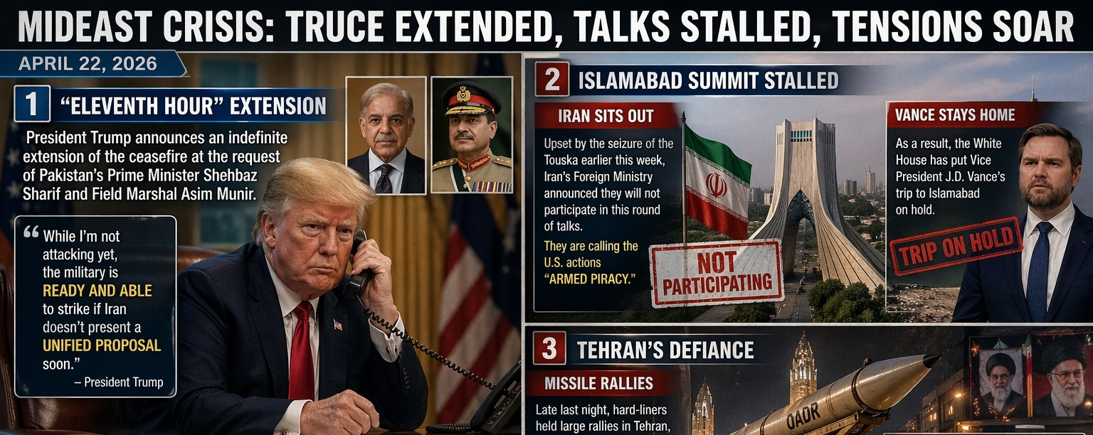 Just as the world was preparing for the bombs to start falling again, President Trump announced an indefinite extension of the ceasefire. Why the change? Trump said he is extending the truce at the request of Pakistan’s Prime Minister Shehbaz Sharif and Field Marshal Asim Munir. The catch: The naval blockade of the Strait of Hormuz remains fully in place. Trump warned that while he isn't attacking yet, the military is "ready and able" to strike if Iran doesn't present a "unified proposal" soon.
