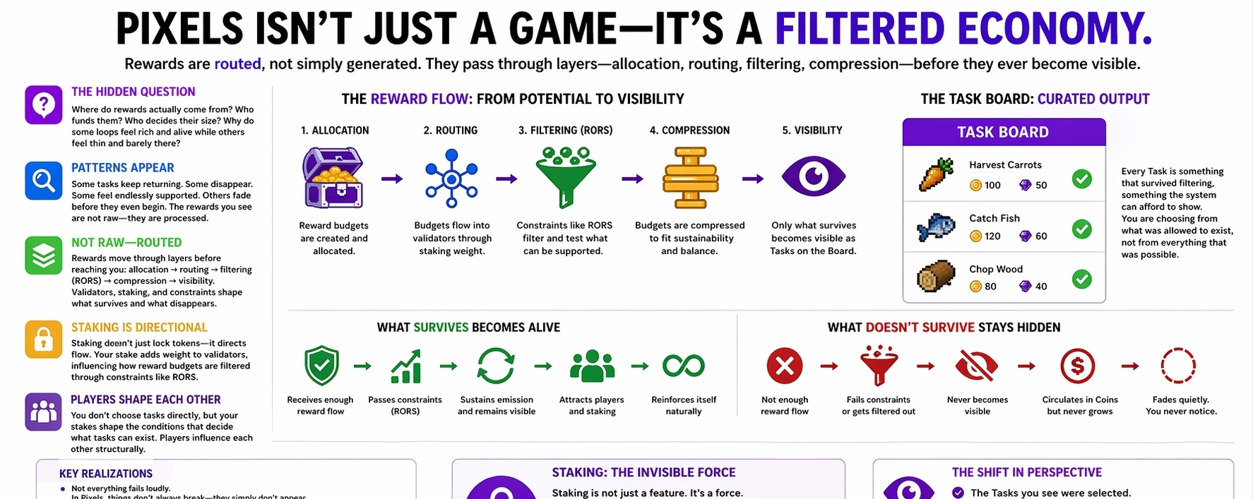 At first, staking in Pixels didn’t feel like it belonged to me at all. It felt like a separate room in the same house—connected, but never necessary. I stayed in the visible layer: planting crops, running loops, refreshing the Task Board, watching numbers rise in a rhythm that felt complete. It was simple. Or at least, it looked simple. Because the longer you stay inside that loop, the more it begins to feel like you’re only seeing the surface of something deeper. A quiet question starts forming beneath everything you do: where do the rewards actually come from? Not the surface explanation, not “complete tasks, earn tokens,” but the real source. Who funds them? Who decides their size? Why do some loops feel rich and alive while others feel thin and barely there? At first, you ignore it. The system works, so you keep playing. But the more you think about it, the more you notice patterns. Some tasks keep returning. Some disappear. Some feel endlessly supported. Others feel like they’re fading before they even begin. And slowly, it becomes clear: the rewards you see are not raw—they are processed. They’ve already passed through something before reaching you. Pixels may look like a farming game on the surface, but underneath, it’s a system where rewards are routed, not simply generated. They move through layers—allocation, routing, filtering, compression—before they ever become visible. Validators, staking, and constraints like RORS sit at the center of this process, shaping what survives and what disappears. By the time a Task reaches your board, it has already been reduced from a larger pool of possibilities. It has already survived pressure. And that realization changes how staking feels. What once looked passive now looks powerful. Because staking doesn’t just lock tokens—it directs flow. When players stake, they push weight into the system. That weight flows into validators, and validators influence how reward budgets are filtered through constraints like RORS. This means staking is not neutral. It’s directional. It’s influence applied before gameplay even begins. So the Task Board isn’t a neutral list—it’s curated output. Every Task is something that survived filtering, something the system can afford to show. And that means gameplay itself is shaped before you ever interact with it. You’re not just choosing what to do—you’re choosing from what was allowed to exist. And that leads to a deeper realization: not everything fails loudly. In Pixels, things don’t always break—they simply don’t appear. If a loop doesn’t receive enough reward flow, or if that flow doesn’t survive constraints, it never becomes visible in a meaningful way. It doesn’t get enough Tasks, doesn’t attract players, doesn’t grow. It fades quietly. Most of its activity stays trapped in lower layers, circulating in Coins without ever becoming something bigger. And you never notice it, because you can’t see what never reaches you. This creates an illusion. When something feels fun, it seems like it’s just better. But that’s not always true. Sometimes it’s simply surviving. A loop feels alive because it receives enough reward flow to remain visible. It clears constraints, sustains emission, and continues to exist. That survival creates activity, and that activity attracts players. Players move toward what feels alive, staking follows what looks successful, and the system reinforces itself without needing to force anything. It becomes a cycle—quiet, natural, but deeply structured. And what makes it even more interesting is that players are part of this structure. Through staking, they influence where rewards go. They don’t directly choose Tasks, but they shape the conditions that decide what Tasks can exist. In that way, players are shaping each other’s experience. Not directly, but structurally. And that changes how success works. In a normal game, something succeeds by being better. Here, it also needs to survive early. If it doesn’t receive enough routed reward flow, if it doesn’t pass through RORS strongly enough, it may never reach visibility. Not because it’s bad, but because it never had the chance. So discovery becomes something else. It becomes selection under constraint. A system where what you see is not everything that exists, but everything that survived. Which means Pixels isn’t just a game—it’s a filtered economy. Every Task, every reward, every loop is the result of layers of selection designed to maintain balance. Most gameplay never reaches that level. It remains below, circulating quietly without ever becoming visible. And this brings everything back to staking. It’s not just a feature. It’s a force. A mechanism that influences where reward flows, what survives, what becomes visible, and what disappears. It shapes the structure beneath the surface while remaining almost invisible to the player. And once you see it that way, the entire experience shifts. You return to your farm, to your crops, to your Tasks—but now you understand something deeper. The Tasks you see were selected. The rewards you earn were filtered. The loops you enjoy survived pressure. And most importantly, there is far more happening than what you can see. So the question changes. Not what should I play next—but who, or what, is deciding what gets to exist in the first place? And how much of what you’re doing never even had the chance to appear?