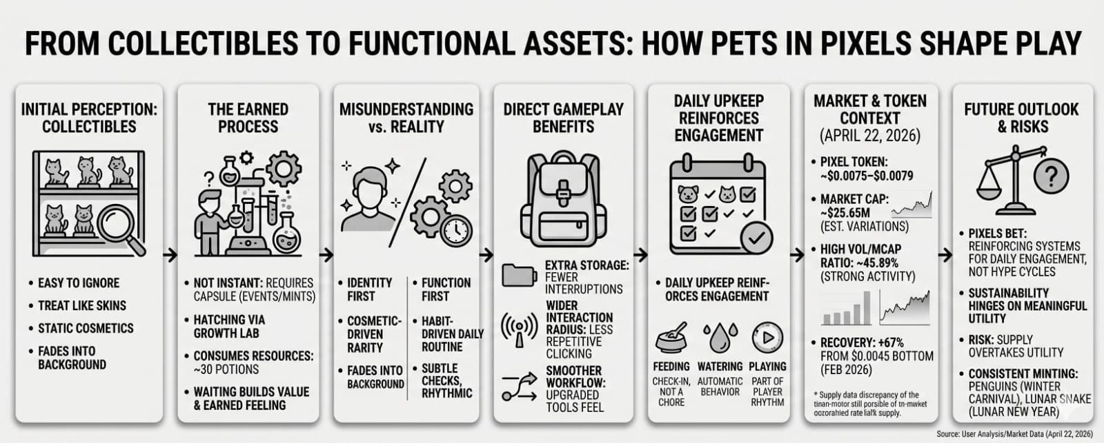Now, from a market perspective, I think a lot of people still misread this system. Pets are often priced and discussed like cosmetics with rarity attached. But Pixels is trying to push them into a different category functional assets with personality. That’s a harder thing to value, because it depends on how much utility actually matters over time.