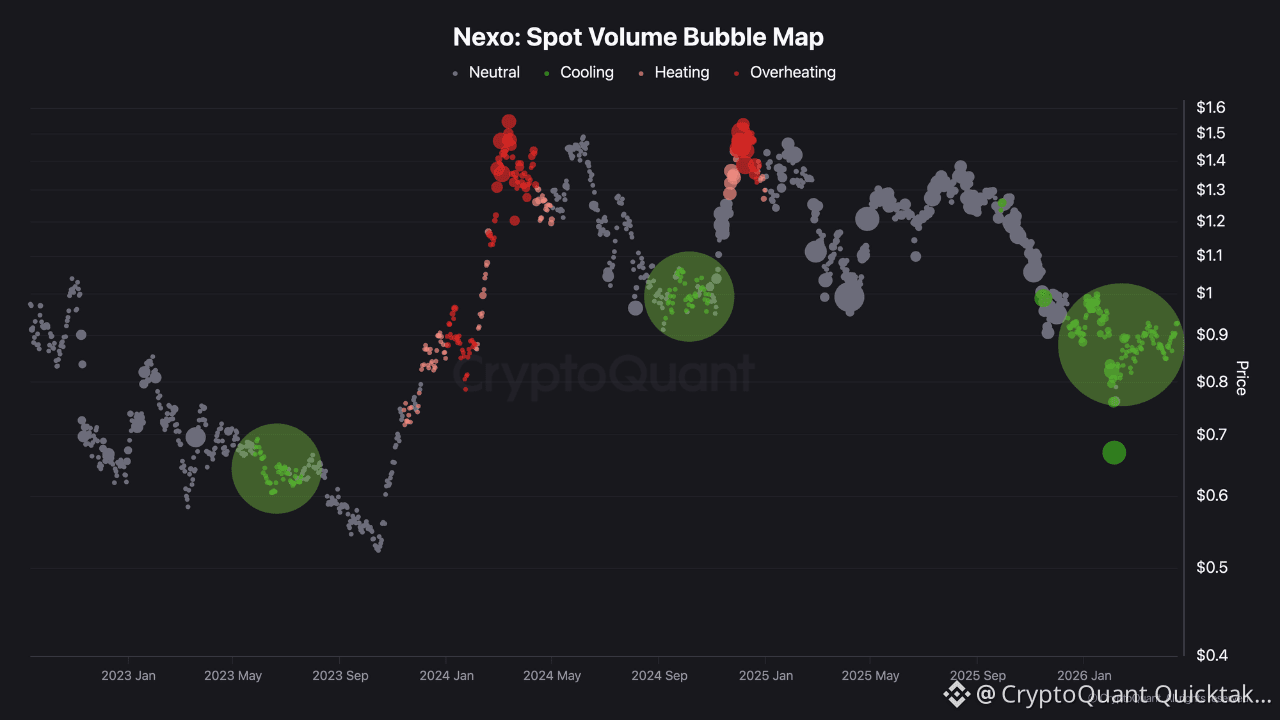 The first instance came in May 2023, when NEXO was trading around $0.60, ahead of a roughly 150% rally toward the $1.50 area. Volumes later moved into an overheated phase as that move extended.