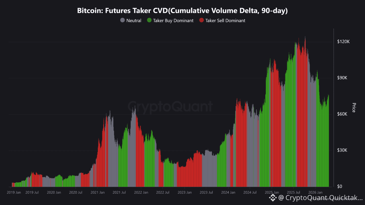 The Futures Taker CVD has been in a steady 90-day uptrend since late March. This sustained rise confirms that aggressive market participants are consistently hitting the "Ask." This is a high-conviction signal showing that demand is actively absorbing any available sell-side liquidity in the futures market.
