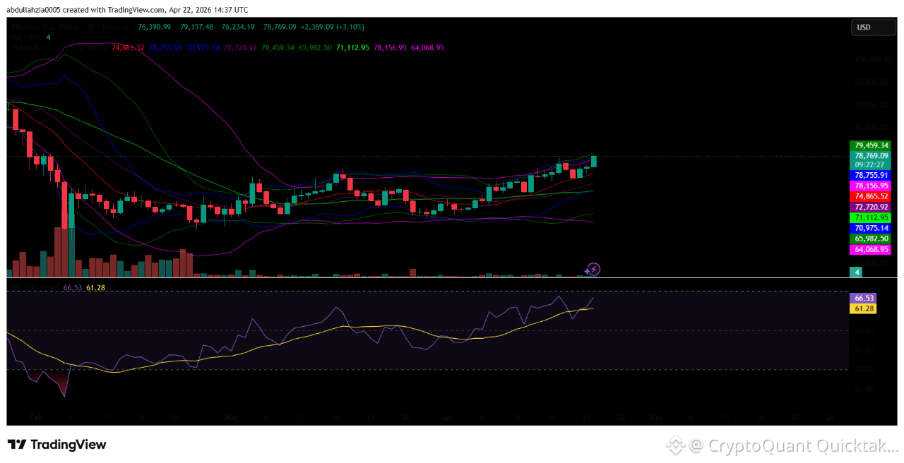On the high-timeframe chart, BTC has printed three consecutive bullish candles, signaling strong price discovery. The price has now entered the Bollinger Band "fast lane" (upper band ride), which indicates that volatility is expanding in favor of the bulls and the trend is accelerating.