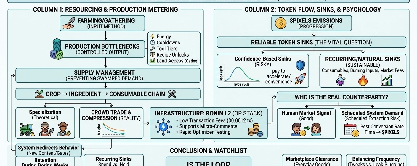 then token flow. $pixels emissions are the easy part to observe: do actions, get rewards, feel progression. but emissions are always the same problem wearing different art: if the token keeps entering circulation, what reliably pulls it back out? and here’s the part i’m thinking about: a lot of sinks in web3 games are confidence-based. players spend when they believe spending will compound into either better gameplay or better earnings. when that belief fades, optional spending dries up fast. so i’m trying to identify sinks that don’t depend on optimism: recurring costs that feel natural (consumables that actually get consumed, crafting that burns inputs continuously, maybe fees that scale with market activity). if sinks are mostly “pay to accelerate” or “pay for convenience,” they might be strong during hype and weak during flat periods. if sinks are mandatory enough to matter, they risk making the game feel like it’s charging rent. it’s a narrow lane.