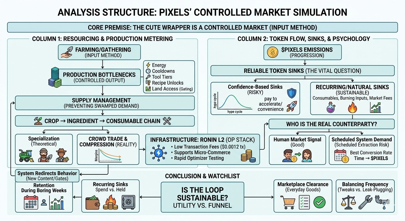 most people talk about pixels like it’s just a farming sim where $pixels is the reward for being consistent. plant stuff, harvest, craft, sell, token goes brr (or doesn’t). but that framing feels too neat. what stands out when i actually follow the loops is that the farming is basically the input method for a controlled market system. like, the cute part is the wrapper; the real action is in how the system meters production and nudges spending.