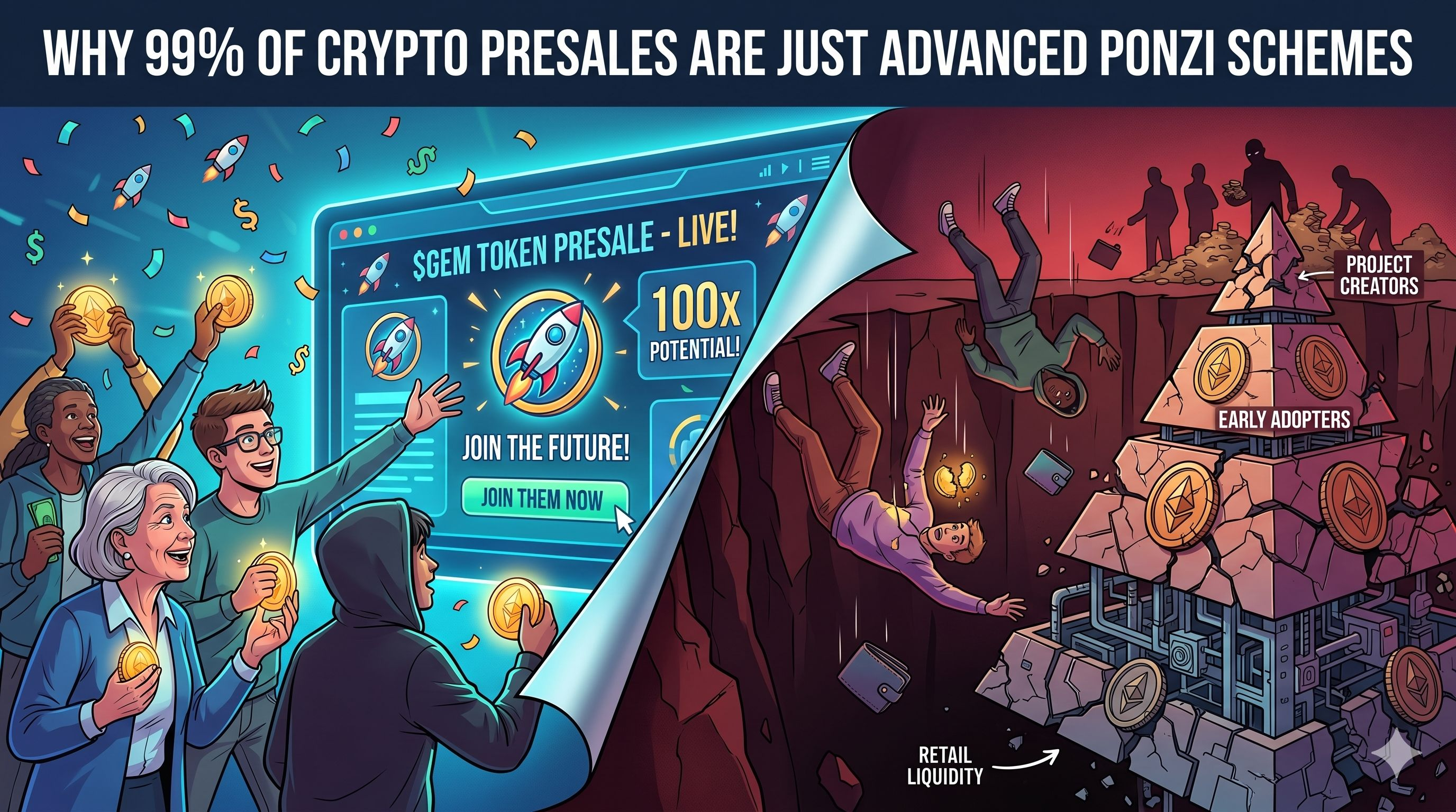 Myślisz, że jesteś wczesnym inwestorem wspierającym rewolucyjną startup technologiczną. Rzeczywistość? Jesteś płynnością. W 2026 roku tradycyjny model ICO/Presale został zmilitaryzowany. To już nie jest mechanizm zbierania funduszy; to prawnie niejednoznaczny schemat Ponzi, w którym twoje depozyty są używane do wypłaty wewnętrznych. Oto dokładny matematyczny podręcznik, którego używają, aby ukraść twój kapitał.