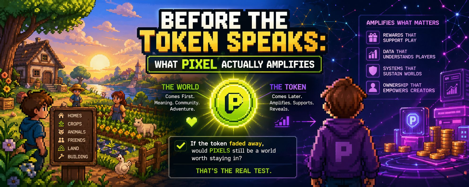 What stayed with me first was not the token. It was the feeling of a place trying to present itself as a place. Pixels talks about homes, crops, animals, friends, land, and small acts of building. Even when ownership comes up, it is usually tied to what players do inside the world, not just to the asset itself. I keep coming back to that order. It feels deliberate. The world is introduced first. The token comes later. And that makes me ask a simple question: if the world comes first, then what exactly is the token there to amplify?