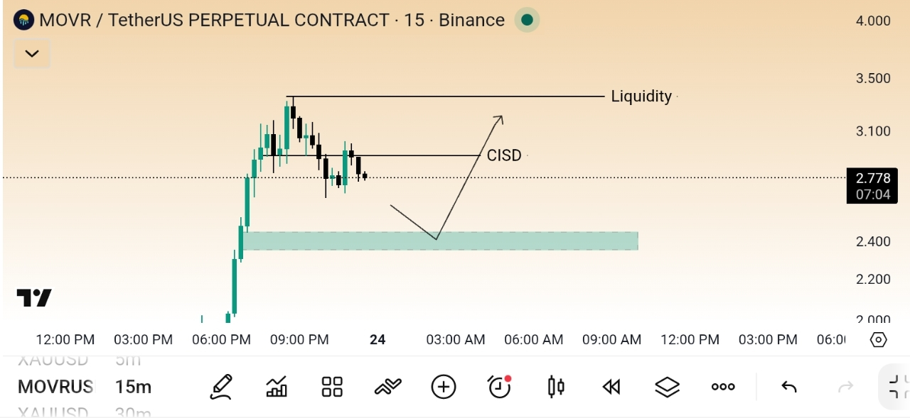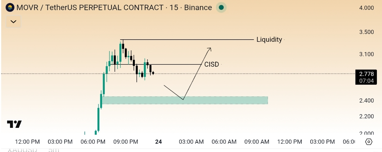 MOVR has made a CISD on the M15 timeframe, due to which a retracement is possible, and there is a high probability fair value gap zone below on the M15 timeframe where we can open a long trade 🧪