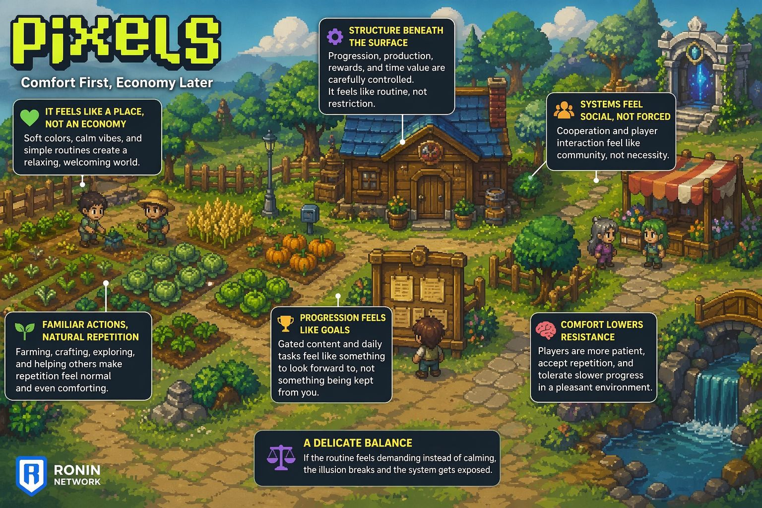 Pixels understands that building an economy is not enough. The real challenge is getting players to exist within it comfortably. By softening the experience, the game makes its systems easier to accept, easier to stay in, and easier to return to.