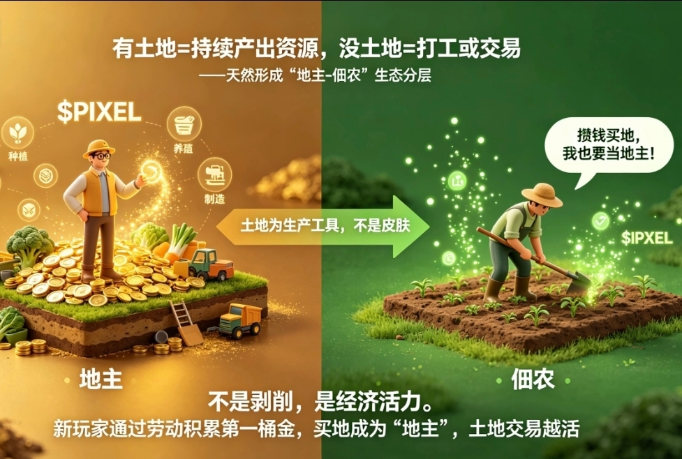 我看到在Pixels的经济模型里,土地其实不是消费品的皮肤,项目给他的定义是生产资料。在游戏里边有有土地的玩家们都可以通过种植、养殖、制造等等措施去持续产出对应的资源,那些没土地的玩家就没这个方法了,他们只能通过打工或交易获取资源。我感觉这就是项目有意思的在游戏里形成了一个地主+佃农的生态分层。那些有资本的玩家可以像现实里一样可以去囤地收租,新玩家你没钱没地也没关,重0开始奋斗,可以通过你的劳动积累你的第一桶金,然后多赚钱争取买块地成为游戏里的可以收租的地主。