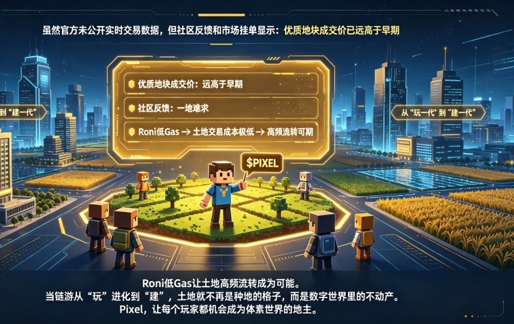 根据我查到的消息,虽然目前来说官方没有公开土地交易的实时数据,但我从社区反馈和市场挂单来看,项目游戏里边优质地块的成交价已经远远的高于早期的时候了。我觉得随着Pixels生态持续扩张,它的土地作为数字地产的稀缺性和唯一性只会变得越来越突出。更何况说,Ronin链的低Gas费也会让土地交易成本变得很低很低,这个低费用成功的让土地后续的高频流转成为可能,希望后边最好能0成本买卖。