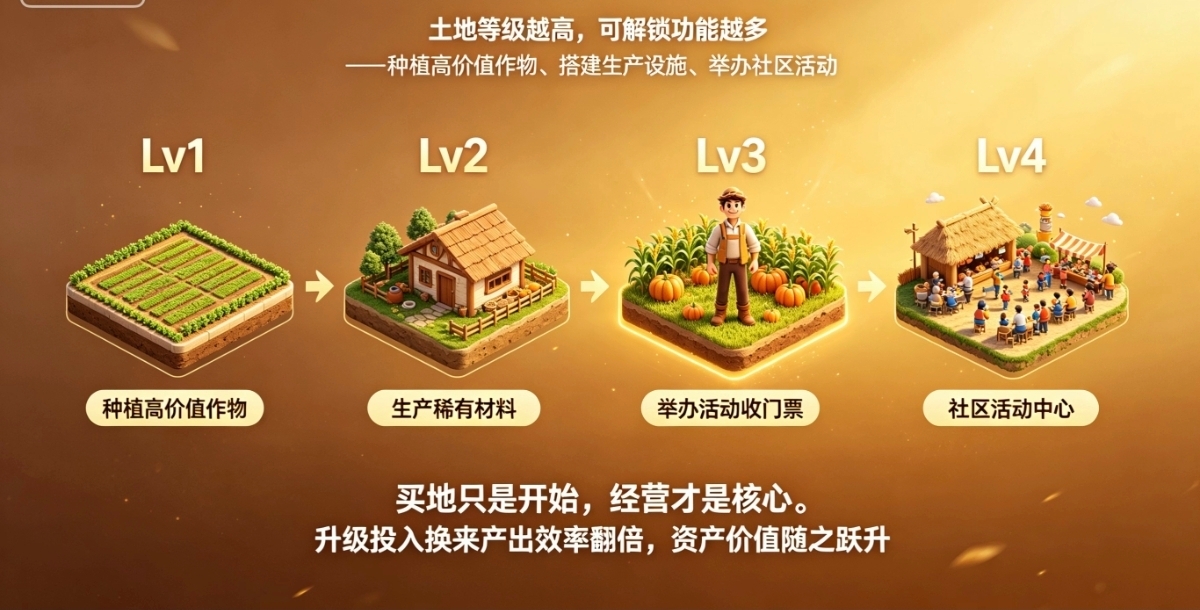 我认为更关键的是,他里边的土地不是随意的摆设。因为你可以在地块上种植高价值作物、搭建你的生产设施、举办社区活动等等。你拥有的土地等级越高,那么你对应的可解锁的功能就会越多。我查到早期玩家用几百美元买下的那些土地,经过玩家的升级和经营后,现在的估值可能基本都已经翻了好几倍了。我觉得这种买入后-通过经营-实现资产增值的逻辑,和我们现实世界中的地产投资是一个逻辑你可以套入里边去理解。