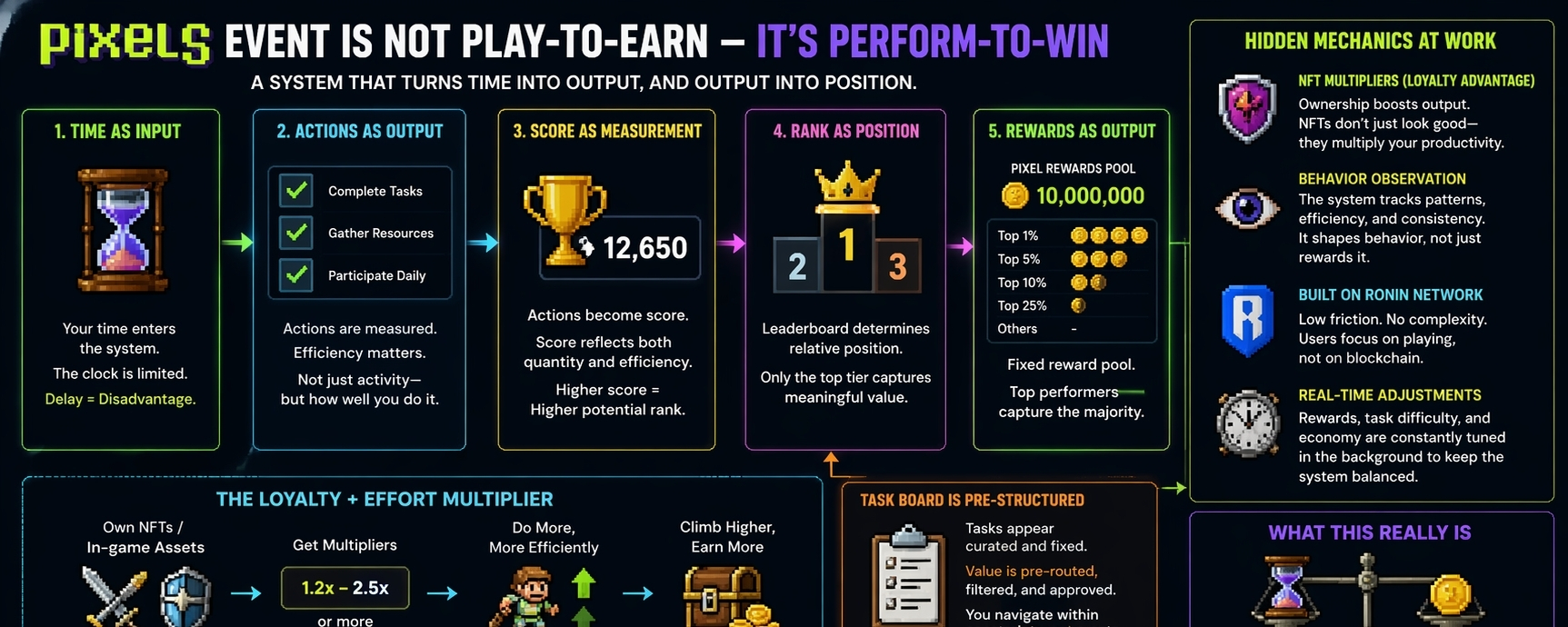 @Pixels The new event inside Pixels might look like a simple loop complete tasks, earn points, climb the leaderboard, and receive PIXEL rewards—but underneath, it feels more like an economic system resetting itself than a game update. What’s really happening is that time is being converted into measurable output: actions become score, score becomes rank, and rank determines access to a fixed reward pool where only the top performers capture meaningful value. This creates pressure immediately, because with a limited timeframe, participation turns into competition, and the longer you wait, the further behind you fall. Features like NFT multipliers quietly layer in a loyalty advantage, where ownership amplifies productivity, tying capital to effort without explicitly forcing it. At the same time, the system isn’t just tracking what you do—it’s observing how efficiently you do it, shaping behavior rather than just rewarding activity. Running on the low-friction environment of the Ronin Network, Pixels removes enough complexity that users don’t feel like they’re interacting with blockchain infrastructure at all, allowing time—not just money—to become the primary input. The result is a loop built on predictability and repetition, where habit drives engagement and stabilizes the economy. Even the task board doesn’t feel reactive; it feels pre-structured, as if value has already been routed, filtered, and approved before it appears, leaving players to navigate within constraints rather than create new outcomes. Beneath it all, real-time adjustments to rewards and behavior keep the system balanced, preventing both over-extraction and stagnation. So while it appears to be a standard “play-to-earn” event from the outside, in reality it’s a controlled environment where time, efficiency, and positioning compete under invisible rules—messy, unequal, and sometimes opaque, but undeniably alive.