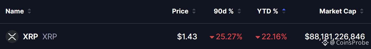 $XRP is currently trading around $1.43, giving it a market capitalization of roughly $88.18 billion. Despite declining 25.27% over the past 90 days and 22.16% since the start of the year, a mix of technical signals and regulatory progress is beginning to shift sentiment back in favor of the bulls.