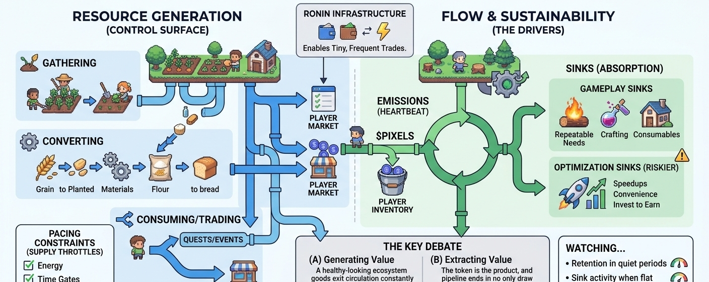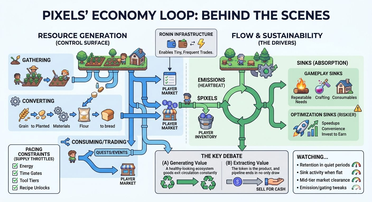 most people (and honestly me at first) talk about pixels like it’s “a farming game with a token.” you plant, harvest, craft, sell, earn $pixels, maybe buy some assets, and ronin makes it cheap so it doesn’t feel painful. that’s the surface story, but it’s not the part that keeps sticking in my head. the part that keeps sticking is how carefully the system tries to control what gets produced, at what rate, and who ends up holding the token when the day’s done.