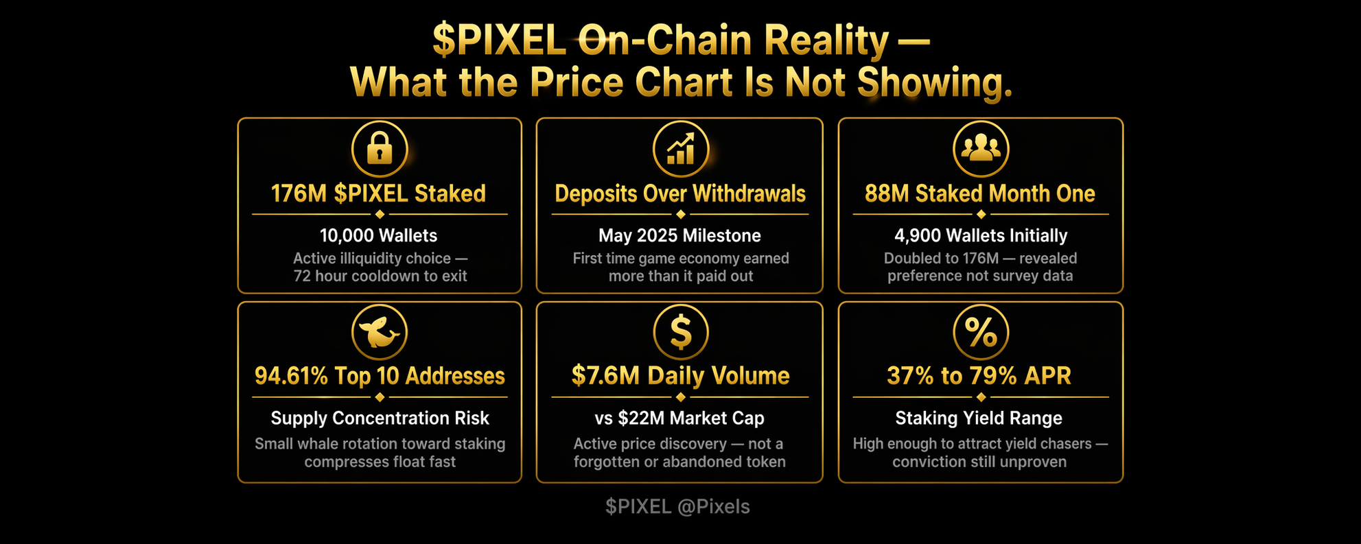 Zacznijmy od danych dotyczących stakowania bezpośrednio. Ponad 176 milionów $PIXEL jest obecnie stakowanych w 10 000 portfeli, rosnąc z 88 milionów stakowanych przez 4 900 portfeli w pierwszym miesiącu. Najważniejszym szczegółem jest 72-godzinny okres ochłodzenia po unstake. Pasywne trzymanie nie kosztuje nic, a tokeny siedzące w portfelu nie działają on-chain. Każdy portfel, który stakował, podjął aktywną decyzję o zmniejszeniu swojej własnej płynności na określony czas. Wybrali brak płynności świadomie. To sprawia, że dane dotyczące stakowania są odkrytą preferencją, a nie odczytem nastrojów, a odkryte preferencje mają większą wagę analityczną, ponieważ mają rzeczywisty koszt związany z nimi.