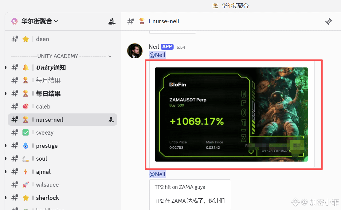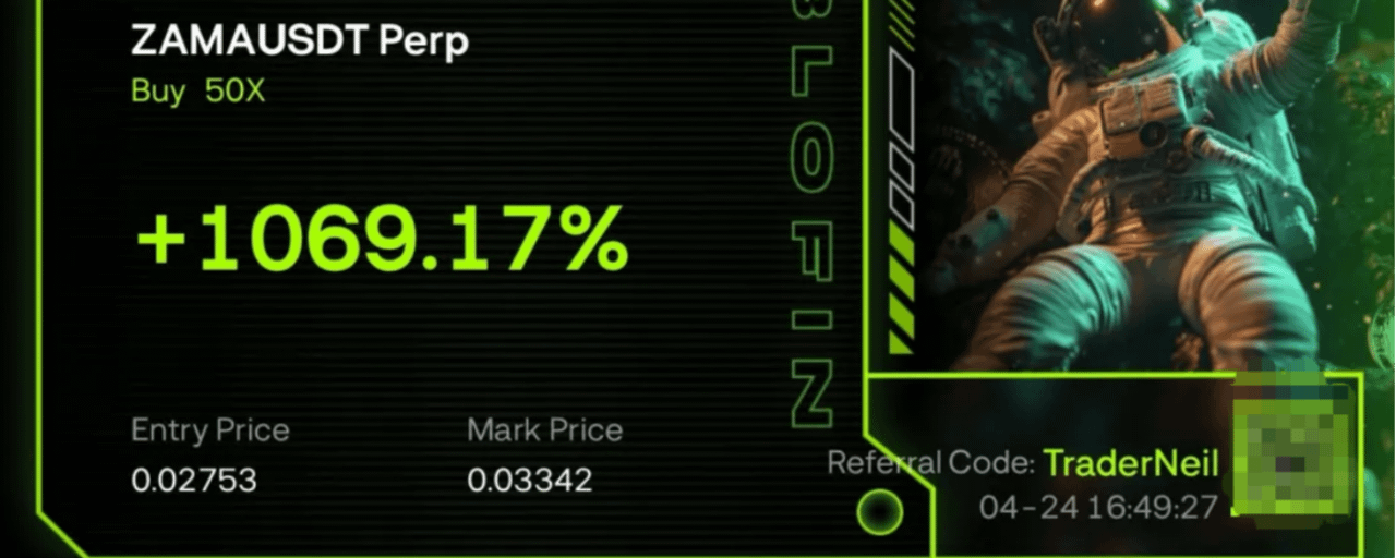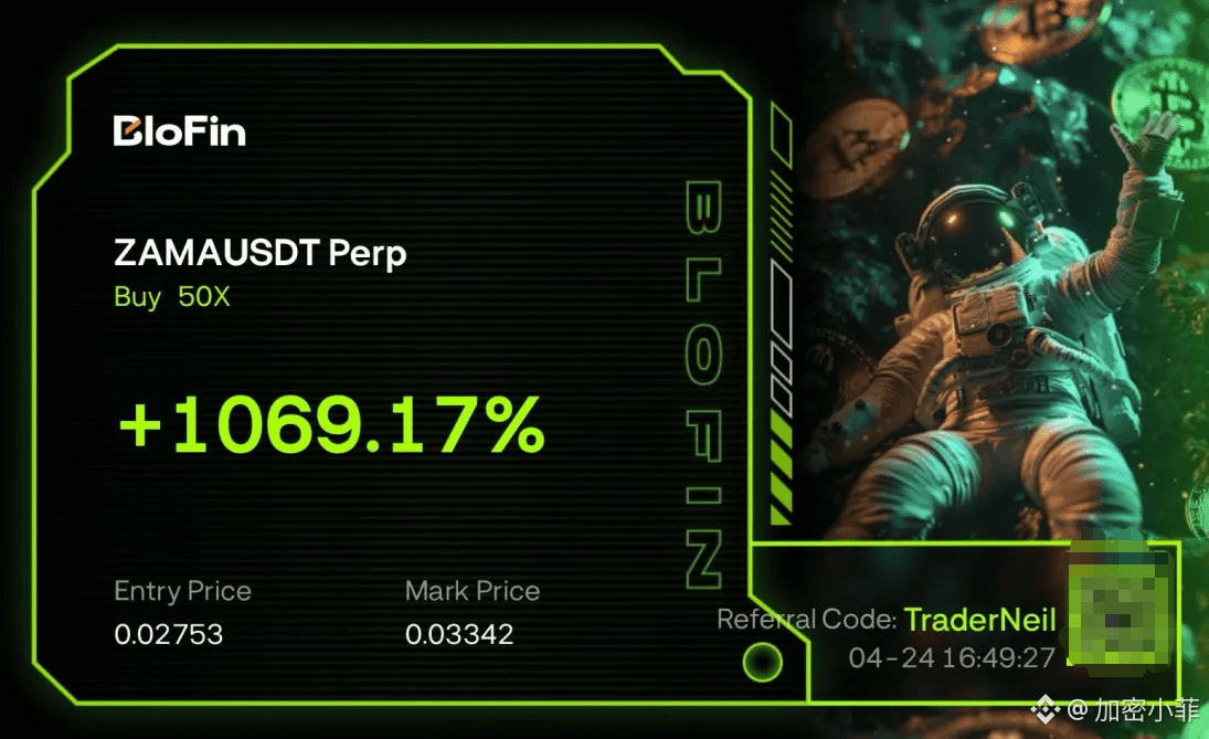 今日我们团队在 BloFin 捕捉到了 ZAMA 的一波暴力拉升。入场点位精准定格在 0.02753,配合 50X 杠杆,在标记价触及 0.03342 时,收益率直接冲破 1069%!