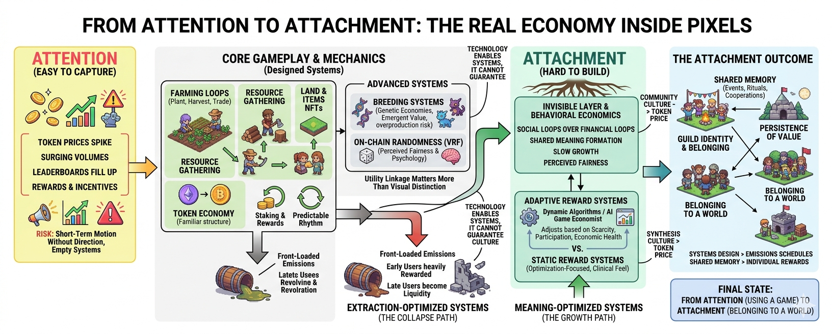 From a macro perspective, Web3 games increasingly resemble digital economies more than traditional games. In some cases, they look like ad networks where attention is monetized and redistributed. In others, they function as platform ecosystems where creators, players, and investors intersect. Pixels sits somewhere in between, acting not just as a game but as a kind of infrastructure layer for social interaction and value exchange.