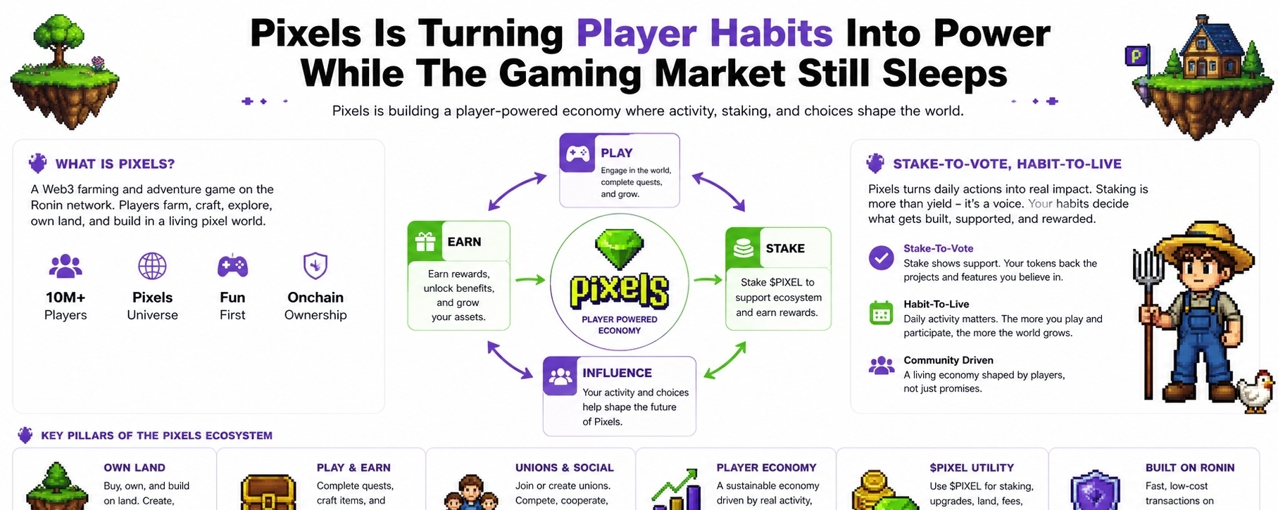 Obecnie Pixels wygląda jak projekt, który próbuje przesunąć gry Web3 z czystego farmienia w kierunku czegoś bardziej zrównoważonego opartego na nawykach i uczestnictwie.