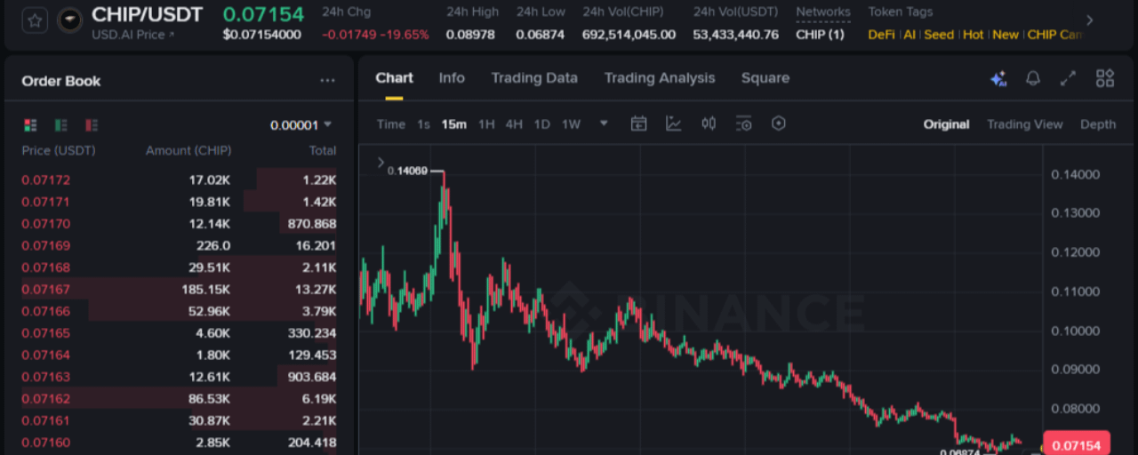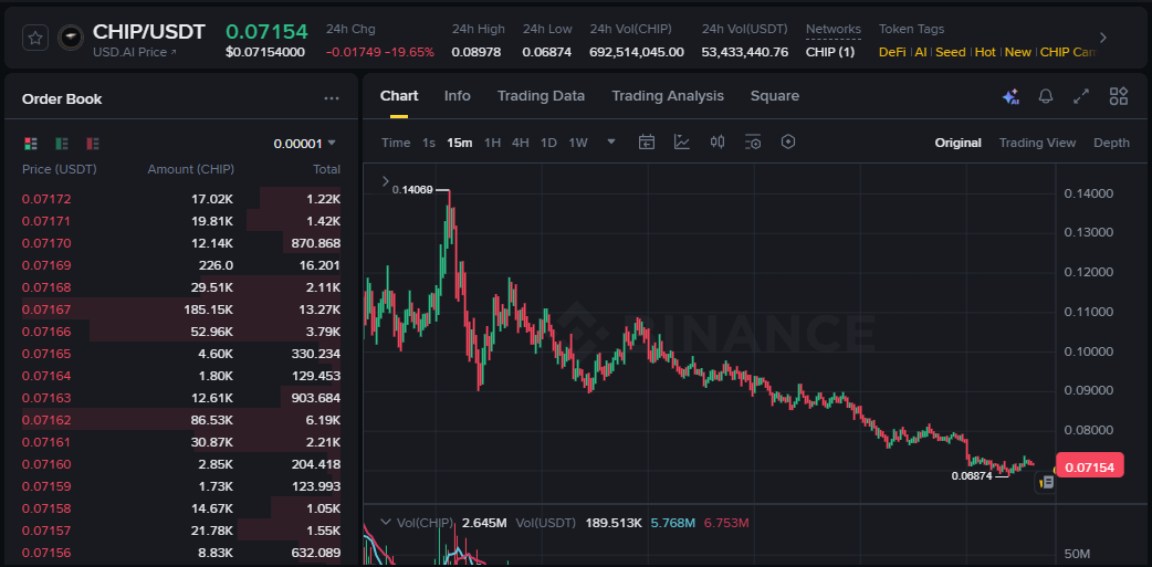 Po początkowym hype i silnym ruchu, $CHIP wyraźnie pokazuje fazę schłodzenia na 15-minutowym interwale.