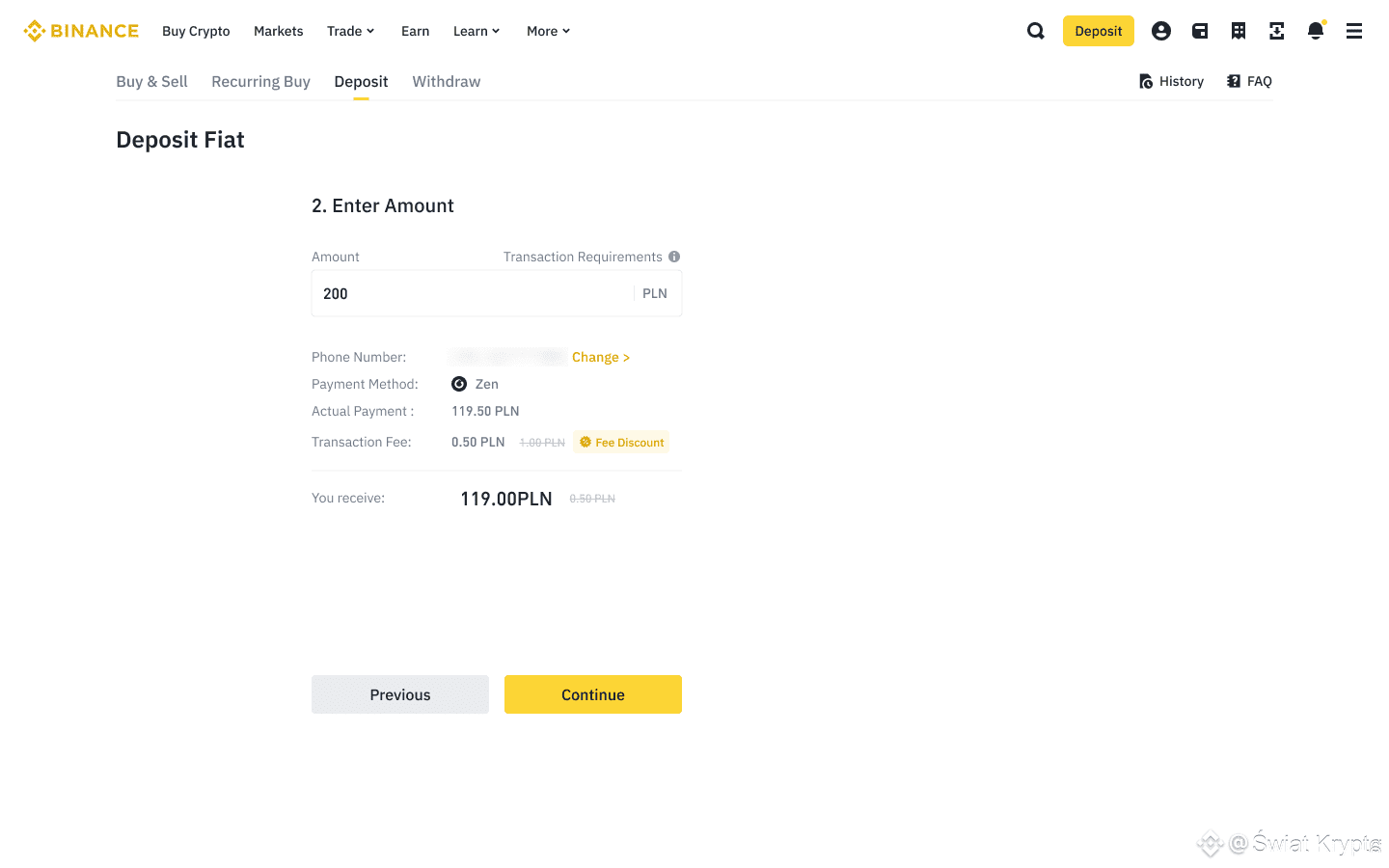 Po połączeniu konta Zen wprowadź kwotę w PLN, którą chcesz wpłacić. System wyświetli prowizję (jeśli jest). Sprawdź wszystkie szczegóły i kliknij [Kontynuuj].