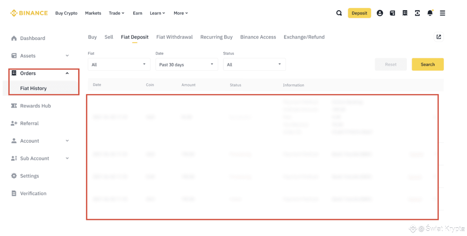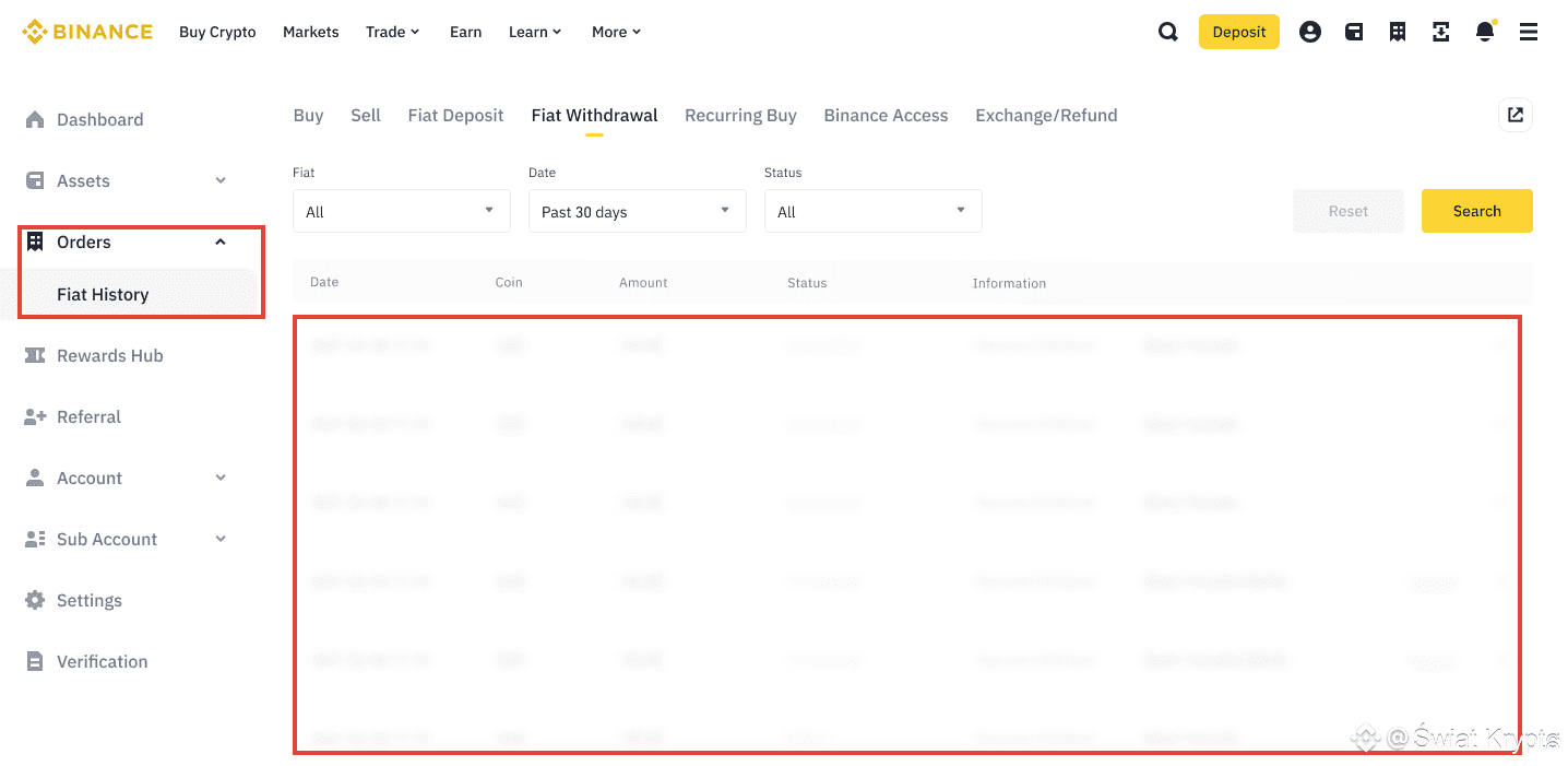 Możesz sprawdzić status swojego zlecenia, klikając [Zlecenia] na stronie "Kup Krypto" i przeglądając historię w sekcji [Historia Fiat].