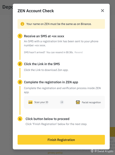 Jeśli nie ukończyłeś jeszcze weryfikacji tożsamości na Binance, zostaniesz poproszony o zrobienie tego teraz. System nie pozwoli ci kontynuować bez pełnej weryfikacji KYC.