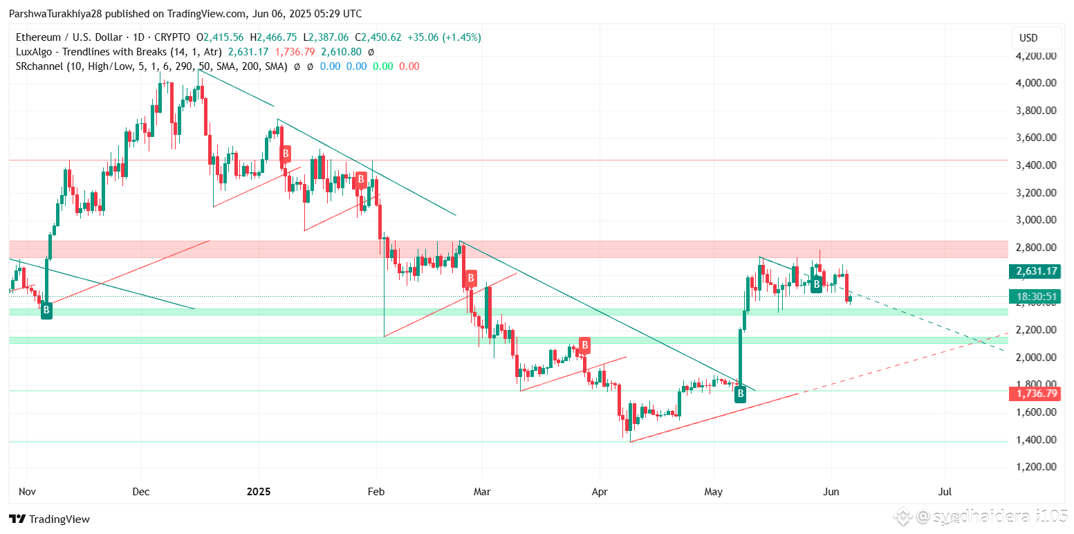 $ETH is trading inside a descending channel (higher upper-bounds repeatedly rejected) which suggests consolidation and/or corrective phase rather than fresh breakout. CryptoPotato+1