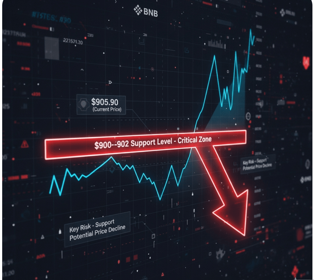 Analitycy bacznie obserwują krytyczny poziom wsparcia dla ceny BNB, zidentyfikowany w przedziale $900-$902. Cena niedawno dotknęła $905.90, co podkreśla znaczenie tej strefy. Utrzymujące się złamanie poniżej tego poziomu wsparcia może potencjalnie prowadzić do dalszych spadków cen w krótkim okresie.