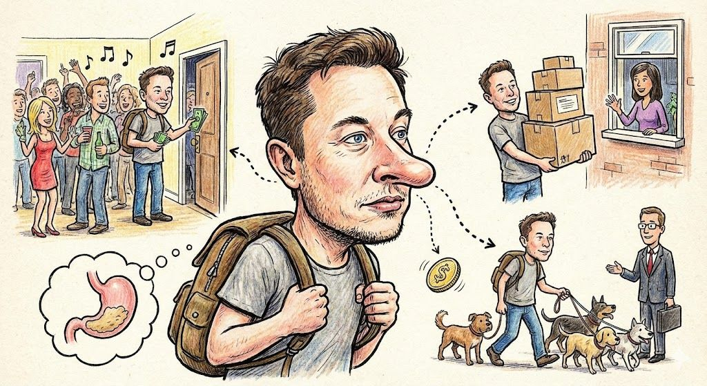 马斯克绝不会去打工,那来钱太慢,简直是浪费生命。他会像猎狗一样嗅出身边那个不起眼的小需求,哪怕看起来有点跌份儿。