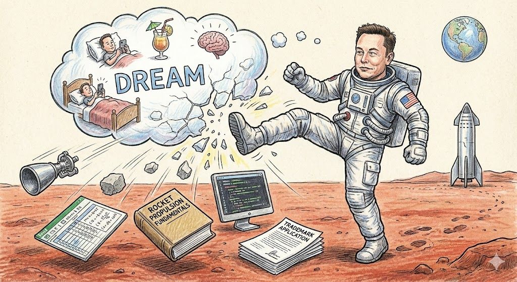 比如,大多数人做梦是我想写小说,然后躺在床上刷了一晚上抖音。马斯克做梦是“我想上火星”,然后今晚就查资料、学物理、算账。