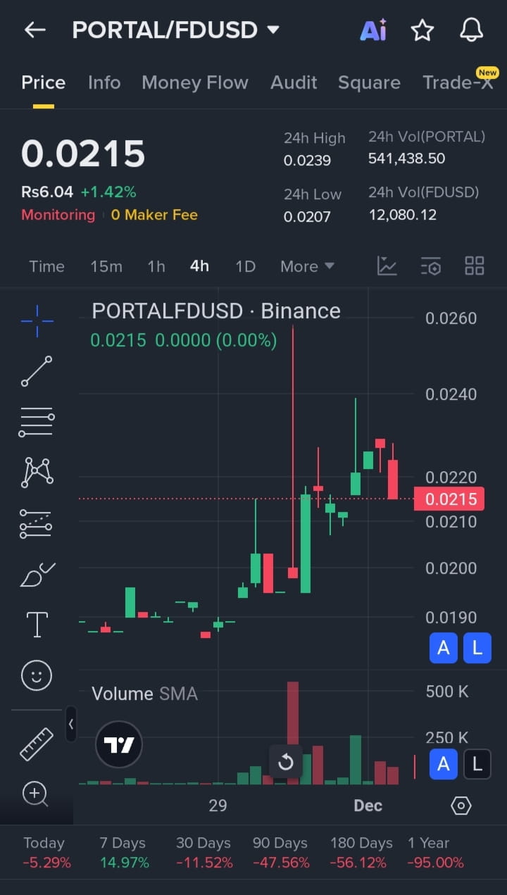 $W/FDUSD: Lider spadków wśród nowych kryptowalut, spadł o -11,86% do 0,0394 USD.