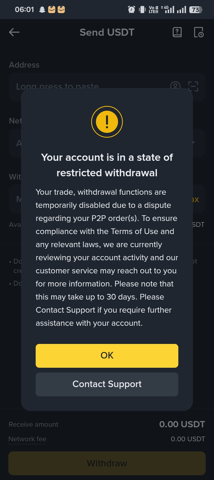 Dziś, próbując wysłać USDT z mojego konta Binance, otrzymałem powiadomienie, że moje konto jest obecnie w stanie „ograniczonej wypłaty”. Zgodnie z wiadomością, moje funkcje handlowe i wypłat zostały tymczasowo wyłączone z powodu sporu związanego z jednym lub więcej moich zamówień P2P. Binance również poinformowało mnie, że teraz przeglądają moją aktywność na koncie, aby zapewnić zgodność z ich Warunkami Użytkowania i odpowiednimi przepisami.