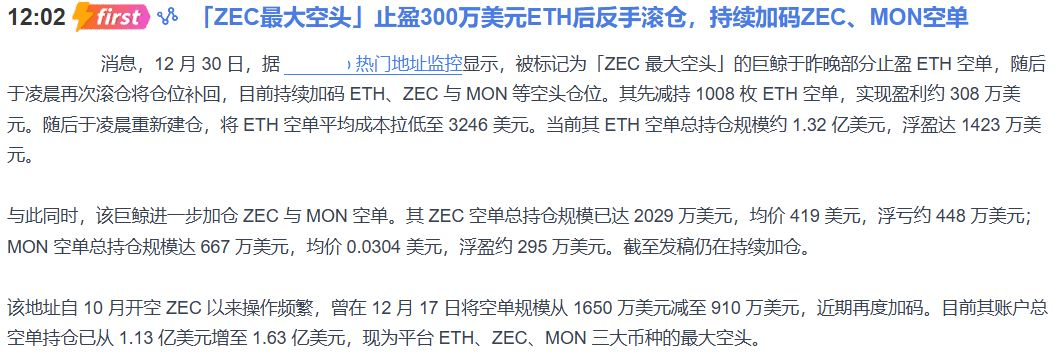 Ten wieloryb, nazywany „największym krótkoterminowym inwestorem ZEC”, zamknął wczoraj pozycję z zyskiem ponad 3 milionów dolarów, a następnie znowu otworzył krótką pozycję i cały czas zwiększa swoje zaangażowanie w krótką sprzedaż ZEC i MON! Obecnie jego całkowita pozycja krótka wynosi 163 miliony dolarów, a sama krótka pozycja ZEC jest warta ponad 20 milionów, a on obecnie ma na niej stratę wynoszącą blisko 4,5 miliona, ale nadal zwiększa swoje zaangażowanie. Co to oznacza? To oznacza, że ten „wieloryb” jest zdeterminowany, aby ponieść krótkoterminowe straty, by postawić na przyszły spadek ZEC.