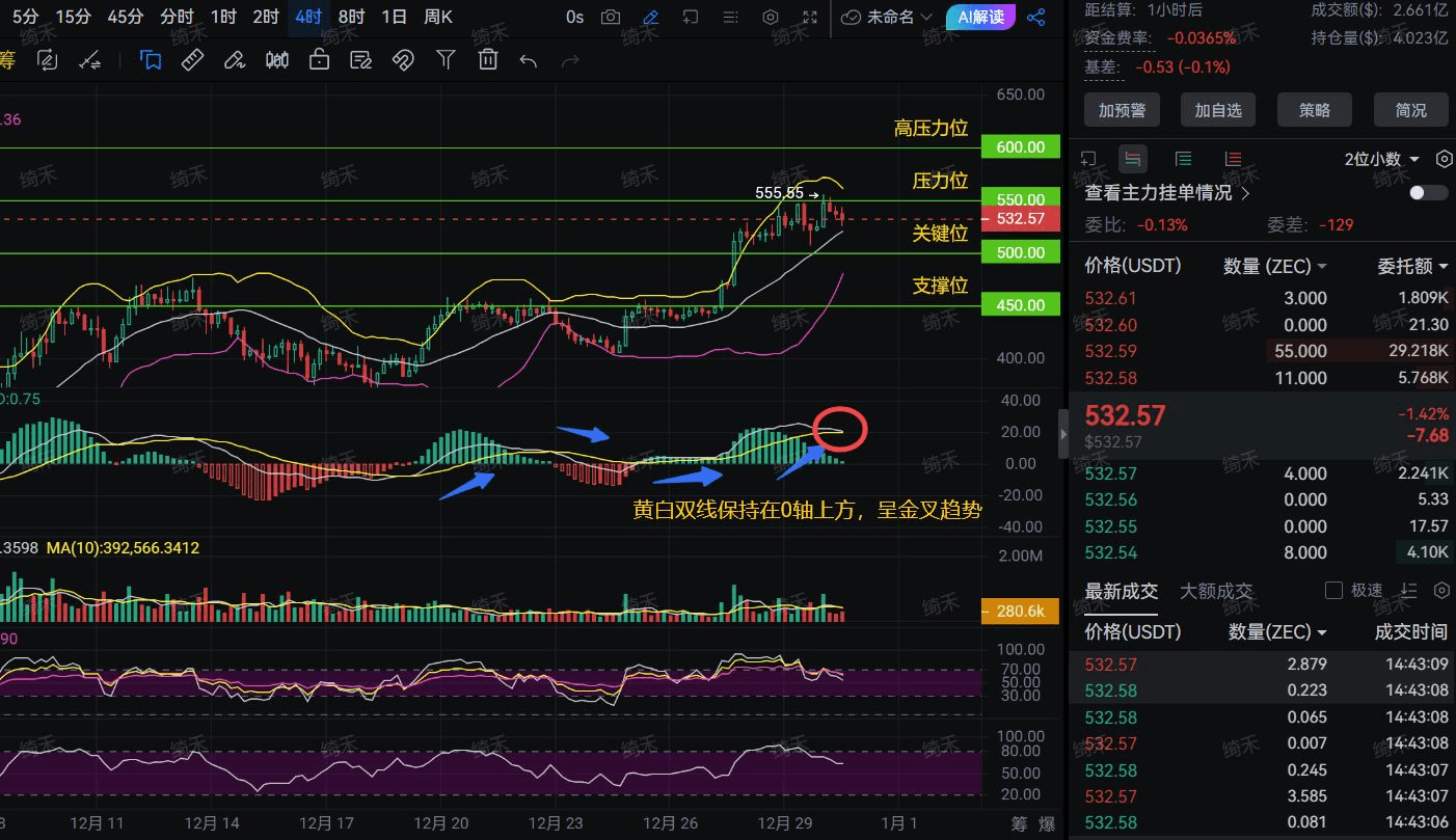 Najpierw spójrz na nasz 4-godzinny wykres K. Trend jest wyraźnie wzrostowy, cena znajduje się w pobliżu 532 dolarów, MACD jest powyżej osi 0 i pokazuje złoty krzyż, co wskazuje, że krótkoterminowo byki dominują. Poziom oporu to 550, kluczowy poziom to 500, a silne wsparcie to 450. Z czysto technicznego punktu widzenia momentum zmierza w kierunku testowania poziomu oporu 550.