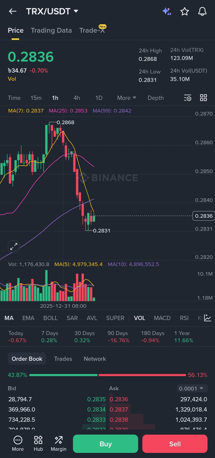 $TRX aktualnie handluje wokół 0.2836 USDT po wyraźnym cofnięciu z 0.2868. Cena przetestowała strefę wsparcia 0.2830–0.2831, pokazując mały odbicie, ale nadal handluje poniżej kluczowych średnich kroczących, co wskazuje na krótkoterminową presję niedźwiedzi. Objętość spadła po spadku, więc możliwe jest wahanie lub drobna konsolidacja. Jasne utrzymanie się powyżej 0.2830 może przynieść krótką ulgę, podczas gdy utrata tego poziomu może otworzyć przestrzeń na dalsze spadki.
