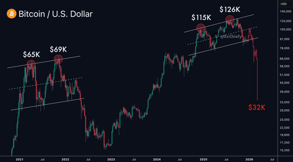 To wyczerpanie jest tłem dla ostrzeżenia tradera Chiefy'ego. W niedawnym poście argumentował, że jeśli model cyklu 4-letniego nadal obowiązuje, Bitcoin może spaść tak nisko jak $32,000 w styczniu 2026 roku. To odważne stwierdzenie, ale oparte na porównaniach strukturalnych, a nie na krótkoterminowych wiadomościach czy nastrojach.