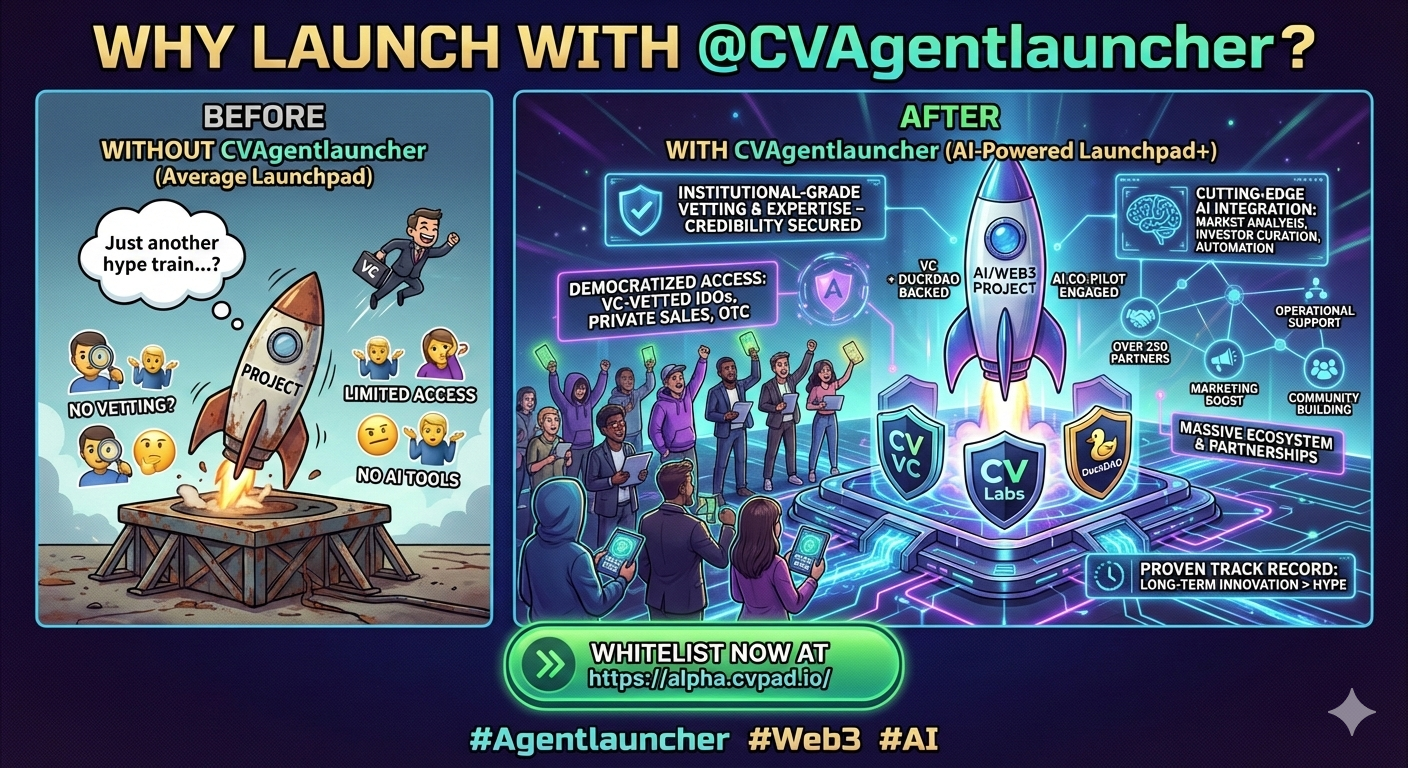 Uruchamianie projektu w dziedzinie AI lub Web3 to emocjonujące — i bezlitosne. Różnica między wyparowanym projektem a trwałym, finansowanym produktem często zależy od odpowiedniego momentu, wiarygodności oraz wybranego start-upu. Oto gdzie wchodzi @CVAgentlauncher (obsługiwany przez @CVPad_io): Launchpad+ łączący rygor instytucjonalny, rozległe eko-system partnerów oraz narzędzia oparte na AI, które dają fundatorom realną szansę na długoterminowy sukces.