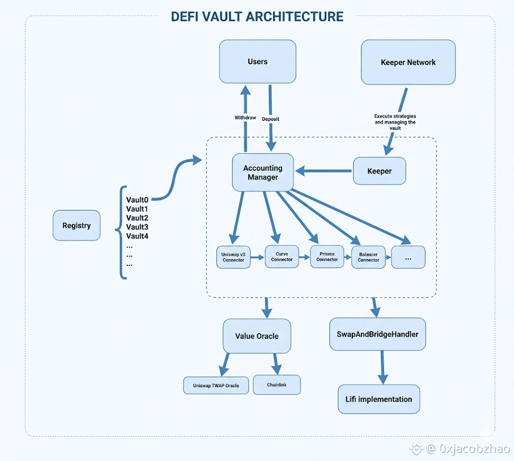 NOYA Vault(金库)的技术架构:各金库通过 Registry 统一注册与管理,AccountingManager 负责用户份额(ERC-20)与净值定价;底层通过模块化 Connectors 对接 Aave、Uniswap 等协议并计算跨协议 TVL,依赖 Value Oracle(Chainlink + Uniswap v3 TWAP)完成价格路由与估值;交易与跨链由 Swap Handler(LiFi) 执行;最终,策略执行由 Keeper 多签 触发,形成可组合、可审计的执行闭环。