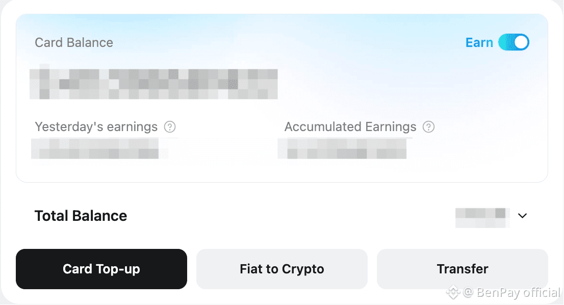 On-chain yield is generated through BenPay’s DeFi Earn system. Once users enable the “Earn” switch, their card account balance is automatically connected to selected on-chain DeFi protocols. It is important to clarify: on-chain yield is not generated by the card itself. Rather, the card account balance participates in on-chain protocols through the DeFi Earn system, resulting in yield generation, with the entire process remaining seamless to the user.